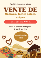 L'APEL St Joseph Arretxea organise une vente de gâteaux / tartes salées et crêpes le samedi 25 avril 2026, à la sortie de la messe (messe des Familles), sous le porche de l’église, à partir de 18h.