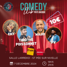 Venez découvrir la nouvelle scène humoristique française le samedi 7 décembre à 19h15 puis à 21h15 à l'espace culturel Larreko ! Quatre humoristes, chacun plus drôle que le précédent... l'occasion de voyager au pays du fou rire pendant 1h20.