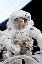« Engoncé dans mon armure, j’ai pris place à l’avant de la station, les pieds rivés dans de gros étriers métalliques. Je chevauche ce véhicule, d’au moins 100 tonnes, lancé comme une fronde cosmique à plus de Mach 25 au-dessus de la terre ».