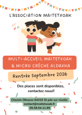 La crèche MAITETXOAK et la micro-crèche ALDAXKA disposent de plusieurs places d'accueil à partir du mois de septembre 2026.