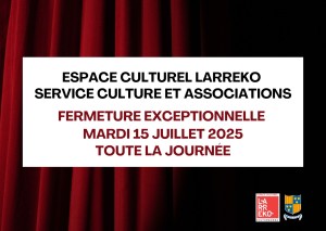 L'espace culturel Larreko ainsi que le service culture et animations seront exceptionnellement fermés le mardi 15 juillet 2025 toute la journée.