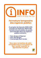 À compter du 9 janvier 2026 à 10h et jusqu’au 10 janvier 2026 à 10h, l’accès et la circulation du public sont interdits dans les espaces publics suivants :