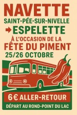La section football du SPUC informe la mise en place d’un service de navettes au départ de Saint-Pée-sur-Nivelle pour transporter les festivaliers à la Fête du Piment d’Espelette les samedi 25 et dimanche 26 octobre 2025.