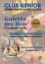 Le CCAS par l'intermédiaire de son Club senior invite toutes les personnes de 65 ans et plus à déguster une part de galette des rois le mardi 21 janvier 2025 à 14h30 à la maison pour tous.