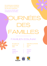 Le Relais Petite Enfance (RPE) Hiru Irri organise à l’occasion des Journées Départementales des Familles de nombreuses animations sur les communes d’Ainhoa, Sare et Saint-Pée-sur-Nivelle, du lundi 4 mai au jeudi 7 mai 2026.