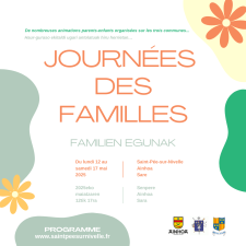 Le Relais Petite Enfance (RPE) Hiru Irri organise à l’occasion des journées départementales des familles de nombreuses animations sur les communes d’Ainhoa, Sare et Saint-Pée-sur-Nivelle, du lundi 12 mai au samedi 17 mai 2025 : un événement porté par le pôle enfance/jeunesse de la commune de Saint-Pée-sur-Nivelle.