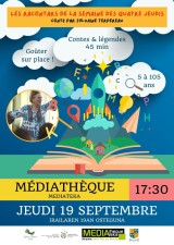 La médiathèque municipale de Saint-Pée-sur-Nivelle vous donne rendez-vous le jeudi 19 septembre 2024 à 17h30 pour une toute nouvelle animation autour des histoires, contes et légendes... Pour cette grande première, la médiathèque a le plaisir d'accueillir Sylvaine Terpereau, conteuse.