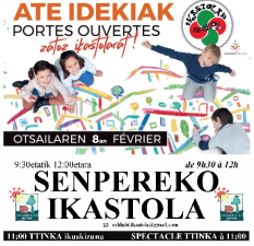 Les portes ouvertes de l'ikastola Zaldubi auront lieu samedi 8 février 2025, de 9h30 à 12h, chemin d'Olhasso. Pour le plus grand bonheur des enfants, le spectacle Ttinka sera joué à 11h.Venez nombreux !