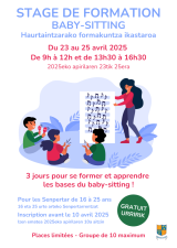 Tu as entre 16 et 25 ans et tu souhaites te former gratuitement et apprendre les bases du baby-sitting ? Nous avons le stage qu'il te faut ! Trois jours de formation, du 23 au 25 avril 2025. Le stage est GRATUIT pour les jeunes résidants à Saint-Pée-sur-Nivelle.