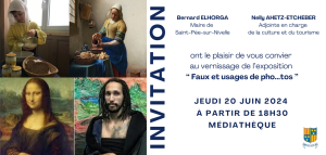 Le service de la médiathèque a le plaisir de vous convier au vernissage de l’exposition « Faux et usages de pho…tos » le jeudi 20 juin à partir de 18h30 à la médiathèque municipale.