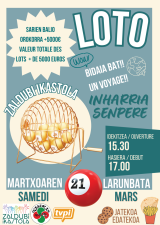 Zaldubi Ikastola organise un loto le samedi 21 mars 2026 à 17h à la ferme Inharria, quartier Ibarron.